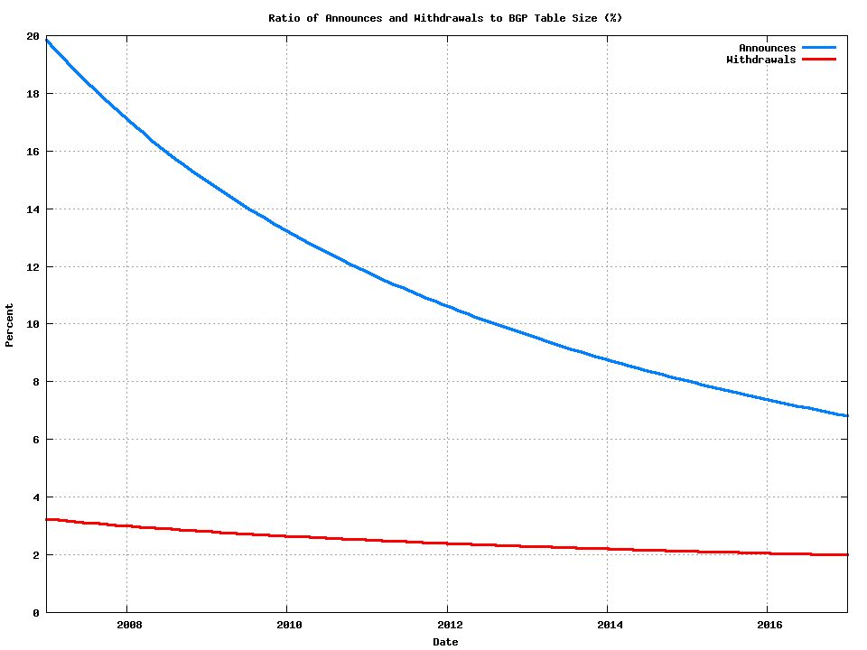 Figure 4 – Ratio of Announce and Withdrawals to BGP Table Size: 2007 - 2017
