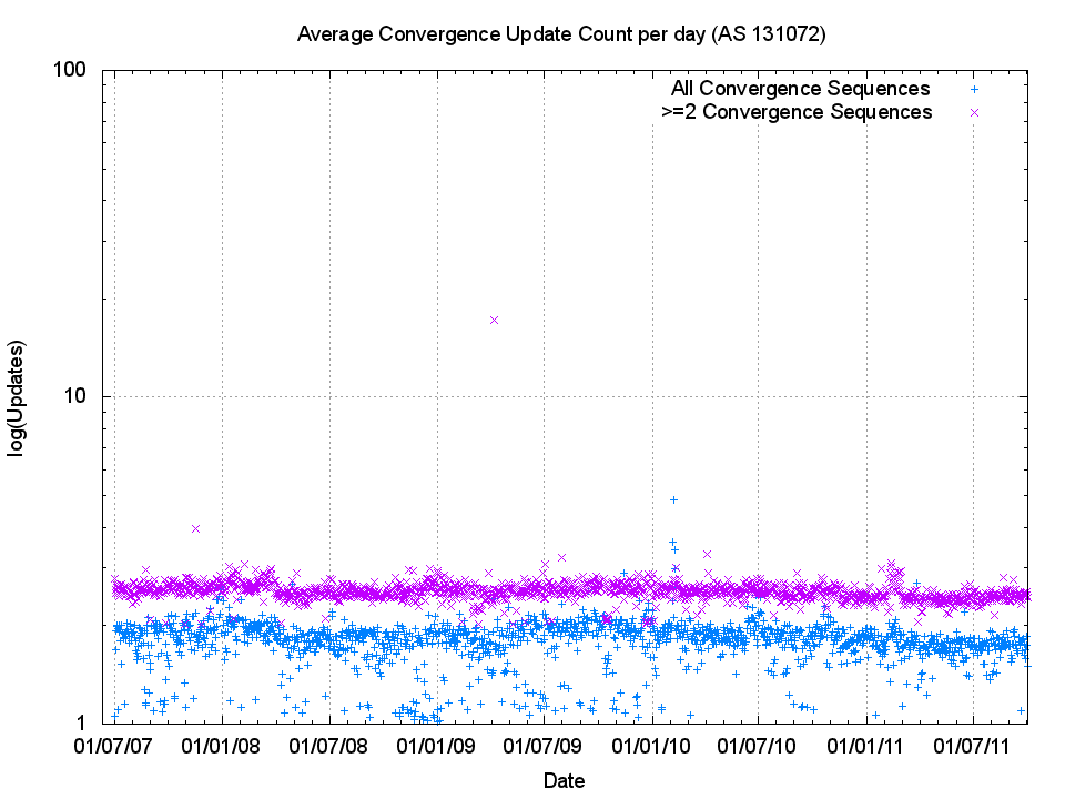 The trend in the number of these 'instability' events appears to be relatively constant on a daily basis. In other words the network as a whole appears to be no more or less unstable now as it was in 2007, with around 60,000 ± 20,000 such convergence events per day, and 10,000 events per day that require 2 or more updates to converge to stability. Figures 7 and 8 similarly illustrate that the trends of average daily convergence sequence length and duration are not changing over time, but have ben extremely steady over time.
