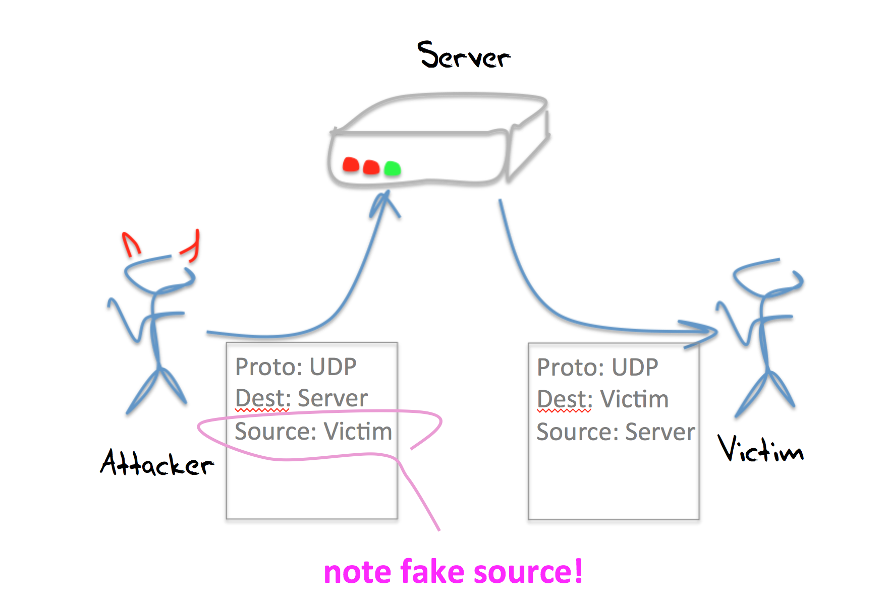 This allows for a simple reflection attack. If the attacker can craft the IP headers of an outbound packet, then all the attacker needs to do is send query packets to the server, but set the source address of these query packets to the IP address of the intended victim. When the server generates a response it will use this faked address as its destination address, and send the response to the intended victim.