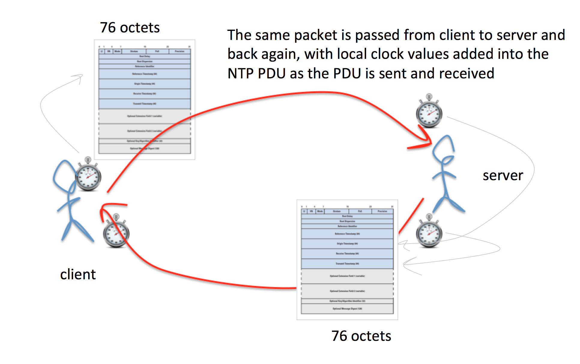 This last point has deterred the use of NTP for DDOS. NTP servers operate as a packet “reflector” in that when an NTP receives an incoming NTP packet it writes its time values upon packet reception and packet transmission, swapping the IP headers. NTP packets are relatively small, and without any optional extensions the incoming and outgoing packets are 76 octets in length. This implies that while NTP is a packet reflector, its not normally an amplifier as well, so attackers have preferred to use DNS instead.