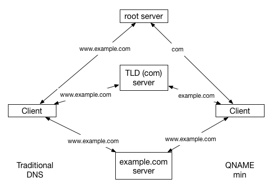 In the DNS Operations Working Group, there has been work to perform what has been called query name minimisation in the DNS, resulting in a specification for “QNAME Minimisation” (RFC7816, March 2016). To quote from this document: "QNAME minimisation follows the principle [of] the less data you send out, the fewer privacy problems you have.” In the example above the query to the root servers for the A record for www.example.com has two elements of gratuitous information: the fully qualified domain name and the query type. A more targeted query that does not gratuitously leak information is a query directed to the root name servers for the NS records for the .com domain. Similarly, the .com name servers would be queried simply for the name servers of example.com and so on (see Figure 2). In general, this approach is no less efficient than using a full query name at every point, and is equally capable of using cached information. The technique has exposed some inconsistencies with the handling of so-called empty non-terminal domain names, but the approach can be implemented in a robust manner, and it is a solid step in plugging a gratuitous information leak. It appears that the recently announced Knot DNS resolver from the CZNIC folk is one of the first DNS resolvers to implements QNAME minimisation (https://www.knot-resolver.cz) , as does Unbound (https://www.unbound.net) (from version 1.5.7, although I understand that the Unbound resolver implementation turns Qname Minimisation OFF by default).