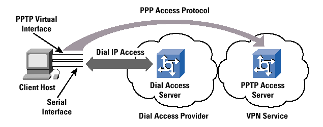 With PPTP in a voluntary tunneling implementation, the dial-in user can choose the PPTP tunnel destination (the PPTP server) after the ini-tial PPP negotiation has completed. This feature is important if the tunnel destination changes frequently, because no modifications are needed to the client"s view of the base PPP access when there is a change in the server and the transit path to the server. It is also a significant advantage that the PPTP tunnels are transparent to the ser-vice provider, and no advance configuration is required between the NAS operator and the overlay dial access VPN. In such a case, the ser-vice provider does not house the PPTP server, and simply passes the PPTP traffic along with the same processing and forwarding policies as all other IP traffic. In fact, this feature should be considered a significant benefit of this approach. The configuration and support of a tunneling mechanism within the service provider network would be one less parameter that the service provider has to operationally man-age, and the PPTP tunnel can transparently span multiple service providers without any explicit service provider configuration. How-ever, the economic downside to this feature for the service provider, of course, is that a "VPDN-enabled" network service can be marketed to yield an additional source of revenue. Where the client undertakes the VPDN connection, there is no direct service provider involvement and no consequent value added to the base access service.